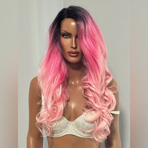 Balayage Pink Wig Ombré Curled Wavy Lace Front Dark Roots