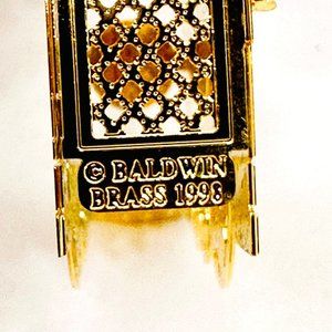 Vintage Baldwin Brass train ornament in the original box. 24kt plated over brass. Beautiful condition. Size is approx. 2.75" x 2". It can stand upright and be a stand alone decoration or an ornament.