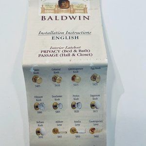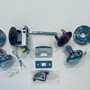 Complete Privacy Knob Latch Set by Baldwin. Polished Chrome with installation instructions, in original Baldwin Box and has not been used. A vintage Architectural Elements inscribed dimensions, Box is about 5.5" x 5" x 4". Made in PA , U.S.A.