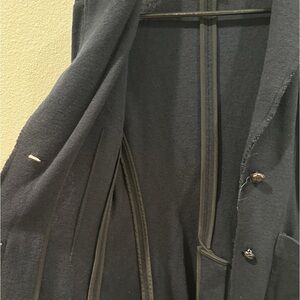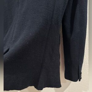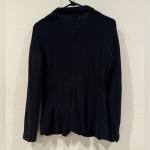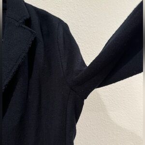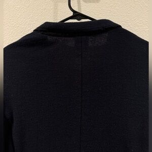 Very dark navy blue (almost black), buttoned cuffs, buttoned front, pockets, collared, knit, wool blend, preppy, academia, raw hem around collar. Nautical, coastal, professional, career, business
