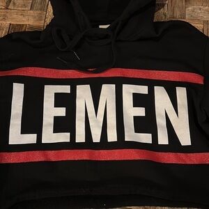 Balements Cropped Women’s Hoodie. Hood with drawstring. Words on hood: street oblige. Black with white lettering and red glitter stripes. Sod Terry interior. Made in Italy. 100% cotton. Size Small