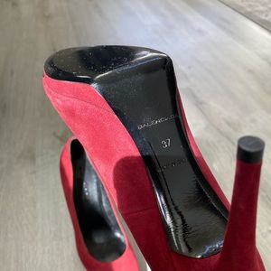 Beautiful and classic pumps by Balenciaga. These are made of red suede leather with a semi-pointed toe and 4" stiletto heel. Fabulous for work, dinner, a formal party and/or cocktail events/galas!