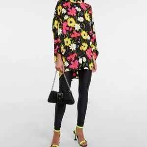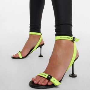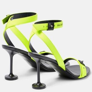 The Afterhour 90 leather sandals from Balenciaga have fluorescent straps, open toes, and stiletto heels with rounded bottoms.