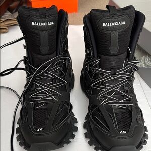 Experience the perfect blend of style and functionality with Balenciaga's black athletic shoes. These high-top sneakers offer excellent ankle support and feature a durable construction ideal for active lifestyles. The intricate lacing system ensures a secure fit, making them perfect for both casual wear and athletic pursuits.