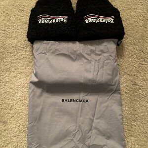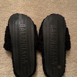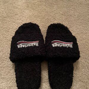 Cozy black slippers with fuzzy texture. Features Balenciaga logo.