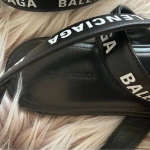 Balenciaga black and white logo rounded-toe flat leather sandals with ankle wrap straps and adjustable clasp
