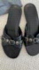 Elegant black leather slides with metallic accents. Perfect for casual outings.