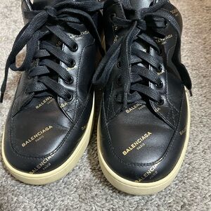 Sleek black leather with cream soles. Balenciaga branding throughout. Stylish and comfortable.