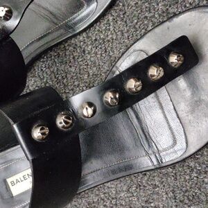 Balenciaga's black leather sandals are embellished with silver tone studs on the T-straps; leather lining; insoles and soles with 3/4" heels