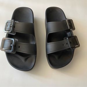Sandals show signs of use, including scuffing, residue on straps and footbeds, and scuffing on outsoles.