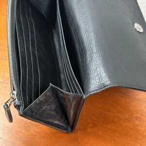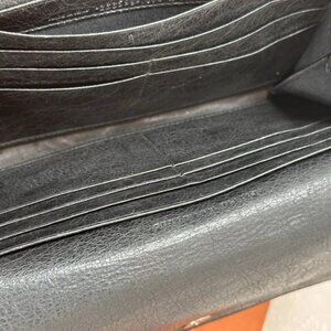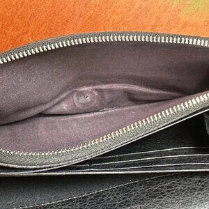This is a beautiful Pre-owned bi-fold wallet made of black lamb skin leather decorated with silver studs. This wallet has a zip pocket for coins, keys etc. The other side of this wallet has slots for bills, IDs, business cards and Credit cards. This wallet is in good condition with minimal wear Except one compartment shows some wear as you can see on the photos.