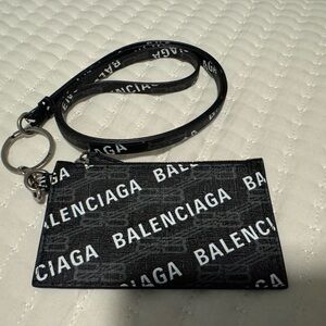 Stylish Balenciaga card holder with lanyard. Features black and white design. Includes original packaging.