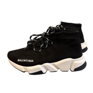 Chic Balenciaga trainers in black and white. Features bold logo and modern design. Original box included.