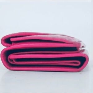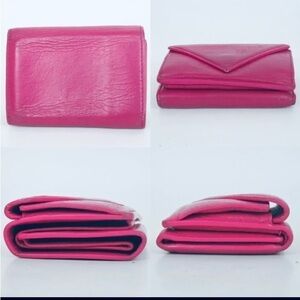 Balenciaga Bubble Gum Pink Mini Tri-fold Leather Wallet - 4”x2.5”. There is Minor Rubbing and Wear on the Corners of the Wallet, and the Balenciaga Name on the Front of the Wallet has Rubbing and Wear