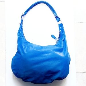 Authentic 2007 Balenciaga Chevre Giant 21 Hobo in French Blue. This stunning hobo is crafted of luxurious leather, with a reinforced looping leather shoulder strap, oversized textured silver hardware, & a front zipper pocket. The top zipper opens to a spacious fabric interior with a zipper pocket. This is an excellent hobo, ideal for everyday wear. Measures approximately 16" x 12", with a 9.25" strap drop. In very good condition, minor fading adds to distressed look. Dust bag included.