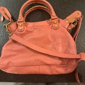 This coveted Balenciaga City bag is crafted in soft coral-pink distressed lambskin leather, featuring iconic gold Giant 12 studs, a zip front pocket, braided top handles, and a detachable crossbody strap. Known for its lightweight feel and edgy yet feminine design.