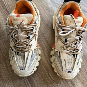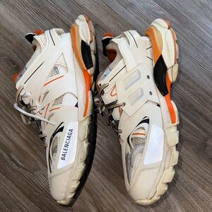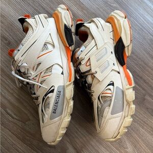 Bold Balenciaga sneakers with cream and orange accents. Ideal for a modern style.