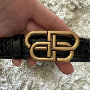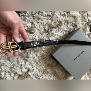 Worn a number of times but essentially in perfect condition. Black, crocodile embossed leather. 1 inch width. Gold buckle. Measurement from buckle to the first hole is 28.5”. I wear size 28 jeans. I am pretty sure it’s a size 80.