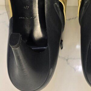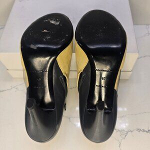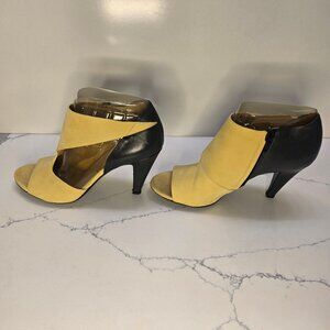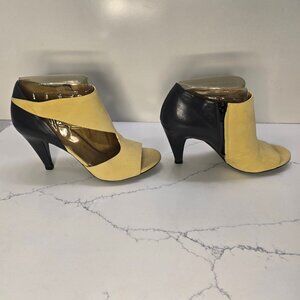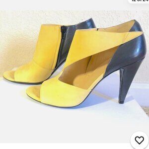 Absolutely stunning Balenciaga two-tone, open toe, cutout booties with inside zipper. Mix of suede and leather in yellow and grey. Heel size approximately 3.25 inches, Europe size 40 but fits US size 8.5 or 9. Made in Italy. Slight scuff on inside left heel (see last pic).