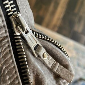 Edgy Balenciaga jacket with a distressed leather finish. Features asymmetrical zipper and classic lapel. Size tag missing. Fits like a 6. Leather . Very high quality designer coat, 100% authentic.