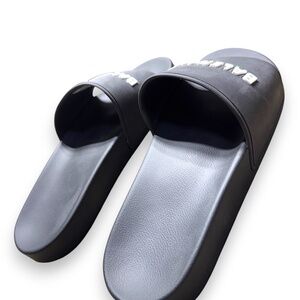 Welded logotype pops in texture and dimension from the bridge of an inky black sport slide molded with a contoured, comfortable footbed.