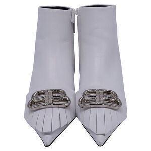 Delivery Duty Paid included – Turn heads with the Balenciaga Fringe Knife Kitten-Heeled Ankle Boots in white leather, a daring fusion of sharp elegance and avant-garde detail. Featuring a sleek pointed toe, sculptural kitten heel, and dramatic fringe, these boots redefine statement footwear. **Style tip:** Let them shine with a minimalist outfit—try cropped black trousers and a fitted blazer for a bold, fashion-forward contrast.