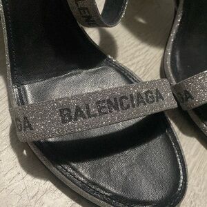 Balenciaga Silver Glitter Wrap Around Black Logo Heels. Leather insoles, chunky block heel. Wrap around ankle strap with an adjustable buckle closure. Made in Italy. These are a size EUR 40 which according to the Balenciaga website is a US size 10 but these run smaller than that! I’d say more accurate to an 8. 3 3/4 heel height