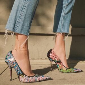 Balenciaga Graffiti Knife Pumps Black Leather Heels Pointed Sz 37.5 / 7.5 US