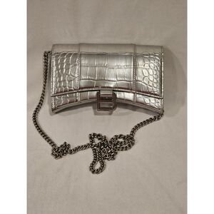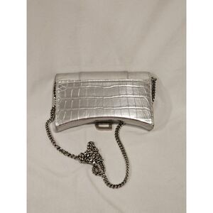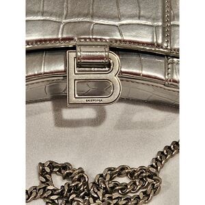 Elevate your style with this stunning Balenciaga Hourglass Crossbody Bag. Crafted from high-quality leather in a beautiful silver color, this bag is the perfect accessory for any occasion. The unique design features a stylish crossbody style that is both practical and fashionable.