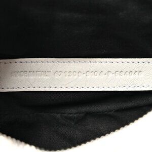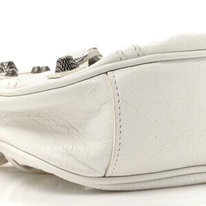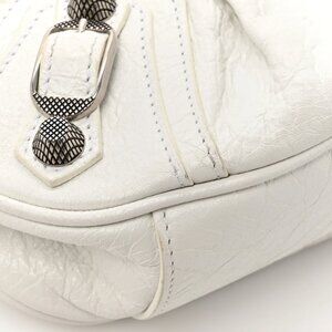 This is an authentic BALENCIAGA Agneau Arena Le Cagole Shoulder Bag XS in White. This stylish and structured handbag is crafted of leather in white. The bag features a matching shoulder strap with silver links and a top zipper, and a matching pouch with a heart shaped mirror. The top unzips to a black fabric compact interior.