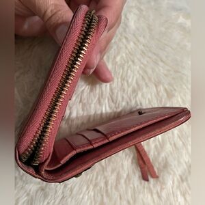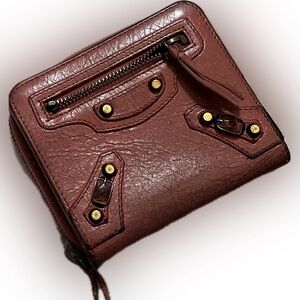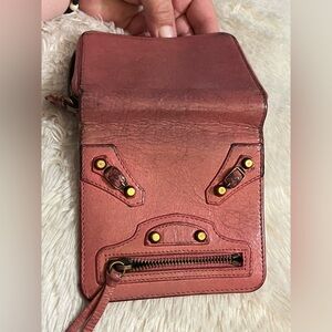 This compact Balenciaga Pink leather wallet features a rich pink hue color and a textured finish, accented with gold toned studs and hardware for an edgy look. Its design is inspired by a motorcycle aesthetic, making it a stylish accessory for any occasion. Preowned with normal usage on exterior as seen in photos.
