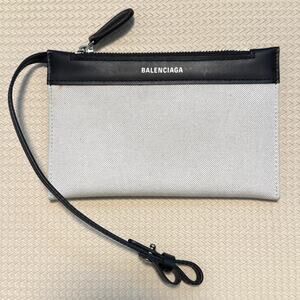 This is a stylish Balenciaga pouch crafted from durable canvas and accented with luxurious leather trim. It's the perfect accessory to keep your essentials organized while adding a touch of designer flair. Could be a wristlet, cosmetic bag, or storage puch for your large tote.