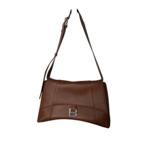 Balenciaga Medium Brown Soft Hourglass Shoulder Bag, Rolled Handle & Single Adjustable Shoulder Strap semi shiny smooth calfskin with nappa lambskin lining and aged silver-tone hardware, made in italy, fold-over flap top with magnetic closure, one main compartment, interior zip pocketback flat pocket, curvilinear shape, metal b hardware on front. Balenciaga Shoulder Bag