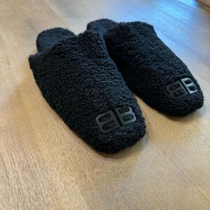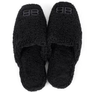 New without box. Balenciaga black shearling BB logo slip on mules. Never worn.