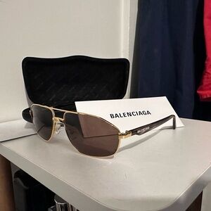 Beautiful and excellent condition, brand new never worn, just tied on.. these Balenciaga men's sunglasses. Featuring a sleek gold frame and black lenses, they offer both luxury and protection. Perfect for any occasion.