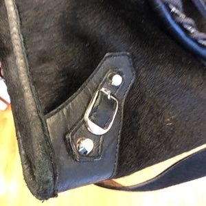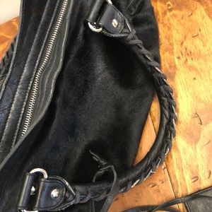 Brass hardware stud and buckle embellishments on front with black leather fringe.