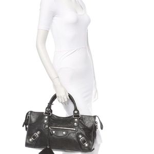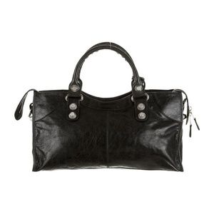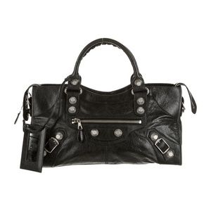 Great Condition, purchased from therealreal about 1 yr ago. Black leather Balenciaga Motocross Giant Part Time Bag with silver-tone hardware, large textured studded embellishments throughout, pocket at front face featuring zip closure, dual buckle accents at sides, dual rolled top handles featuring whip stitch details and attached mirror, black woven lining, single pocket at interior wall with zip closure and two-way zip closure at top. Includes dust bag. Handle Drop 6”, Height 9.5, Width 16.5”