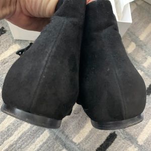 Black Suede Point-toe, small black stacked wooden heel