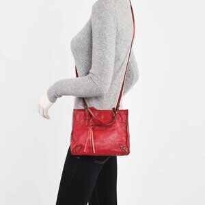 Balenciaga has a knack for delivering classic style in a modern way. This incredible mini bag from F/W 2012 (K) features super soft Poppy red calfskin leather, antiqued hardware with a chic mini tote style. This tote has an invisible magnet at the top, a matching mirror, and a removable long strap to wear this cutie as a crossbody bag. This tote has the impeccable workmanship that Balenciaga is known for. Retail price is $1245.