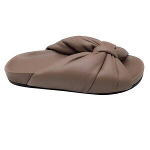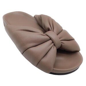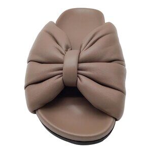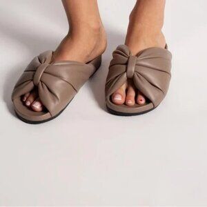 Puffy slide sandals crafted of buttery-soft leather with bow-like design
