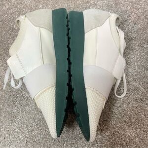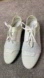 Good preowned condition, there is some wrinkling of the leather, couple very light pink spots, a spot from the glue, black lines on insole, some minor pilling, and some minor wear on the bottoms