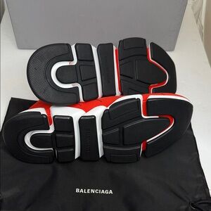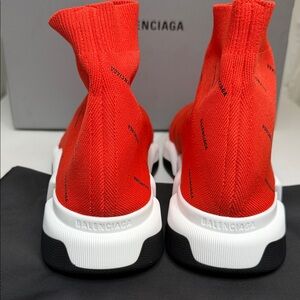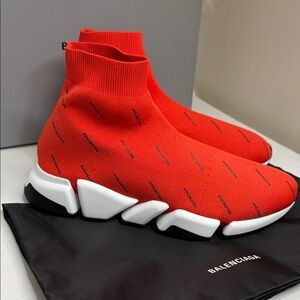 Bold red Balenciaga Speed Trainer sneakers. Features a sleek sock-like design. White sole for contrast.