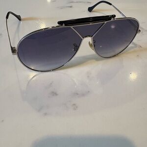 Experience the perfect blend of luxury and style with Balenciaga's silver aviator sunglasses. Featuring a sleek metal frame and gradient lenses, these sunglasses offer both elegance and functionality. The classic teardrop shape and adjustable nose pads ensure a comfortable fit, making them an ideal accessory for any sunny day. Used with missing nosepad. Price reflects accordingly. Sold as is