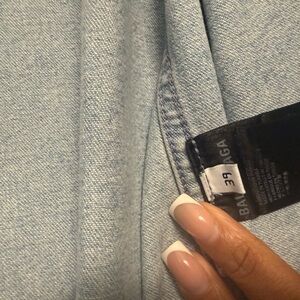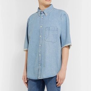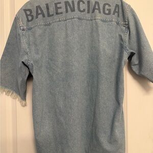 Sky blue denim overshirt with frayed short sleeves. Bold Balenciaga lettering on the back. worn twice. dry cleaned.