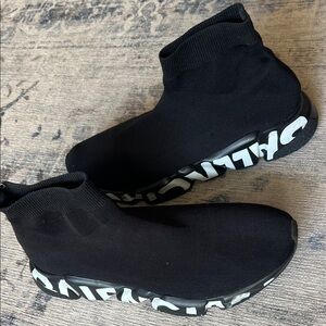 WORN. Small scratches. Step into style with these sleek black sock sneakers. Perfect for any casual outing.