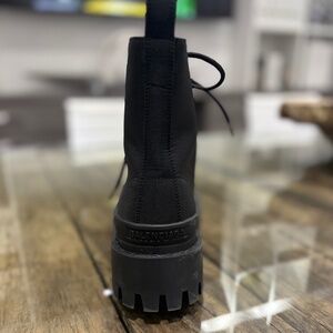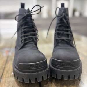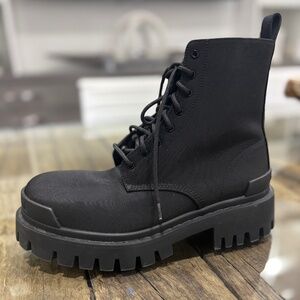 Won 2-3 times, Balenciaga, Stoke nylon, combat booties with stacked heel, round toe, rubber sole. Made in Italy Comes with original box and dust bag. Current retail price $1250 save 50% barely worn!
