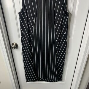 Chic and sophisticated, a Balenciaga midi dress featuring a striking black and white striped pattern. This sleeveless dress offers a clean, modern silhouette with a flattering fit. The design incorporates subtle detailing to enhance its overall appeal. Made in Italy, this dress exudes quality and style. Perfect for a professional setting, a stylish daytime event, or a chic evening outing.