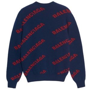Balenciaga sweater with repeat logo. Brand new! No flaws. Navy blue and red wool jacquard knit sweater size L. Never been worn. These Balenciaga sweaters are timeless!