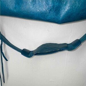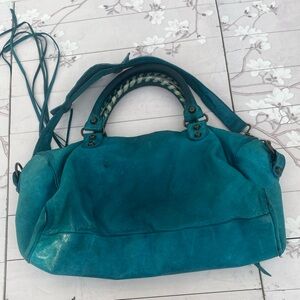 Elegant teal leather satchel with braided handle. Features front zip pocket and adjustable strap.