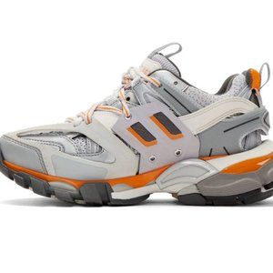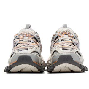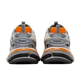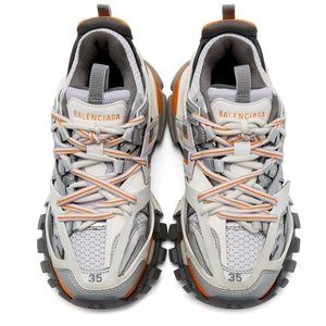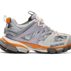 Low-top mesh, faux-leather, and rubber sneakers in grey and 'lilac' purple. White and 3M reflective trim throughout. Logo embossed and sizing embroidered in grey at round toe. Lace-up closure in white, orange, and grey. Webbing pull-loop and embossed logo at padded tongue and heel. Logo printed in black at outer side. Foam rubber midsole in orange and grey. White and grey treaded rubber outsole. Tonal stitching.